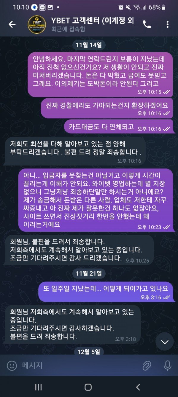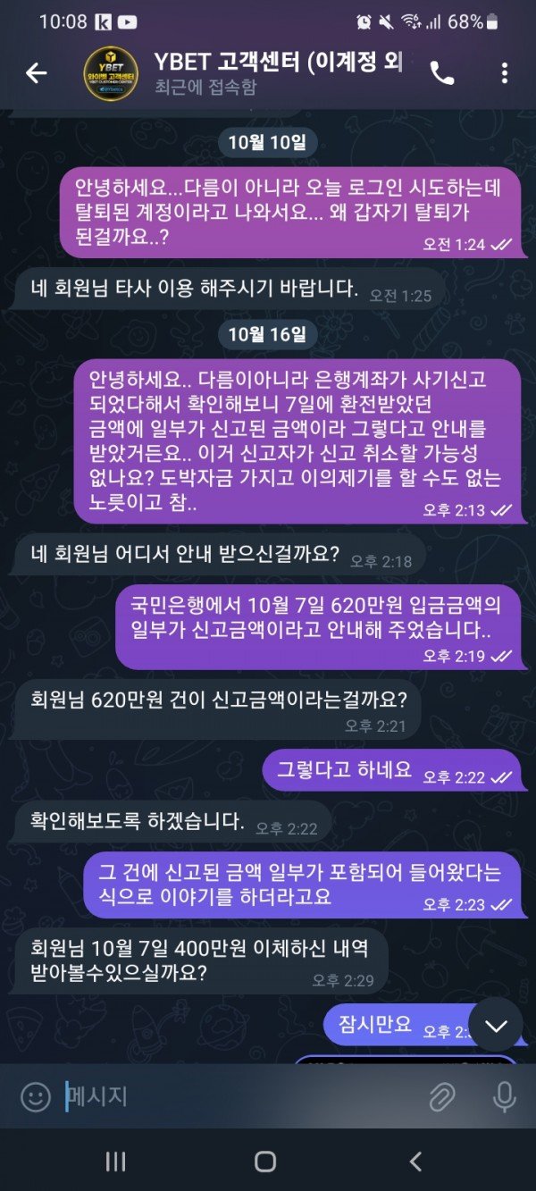 Ybet 핑돈으로 환전해줌 작성자 정보 노바복스 작성 작성일 2025.02.03 10:24 컨텐츠 정보 138 조회 목록 사이트명 와이벳 먹튀주소 Ybet09.com 피해금액 6300000 피해 내용 본문 와이벳... 먹튀는 아니지만 환전 내어준돈에 보피신고된 돈이 있어서 계좌 3개월째 못쓰고 제가 그돈에서 또 보낸 사람이나 다른 업체, 기관까지 엄청난 피해를 보고 있는데도 세달동안 알아본다고만 하다가 이젠 지기들이 연락할때까지 연락도 하지 말라며 아예 대꾸를 안해주고 있습니다. 대응태도를 보면 환전내주고 3일뒤에 탈퇴시키고 그로부터 또 3일 지나서 신고된게 와이벳이 일부러 그런게 아닌가 하는 의심도 너무 들어요.. 암튼 쓰시는 분들 조심하세요. 앞으로 비대면 계좌도 개설 못하는데 보상도 안해주고 쌩까고 ㅠㅠ 관련자료 이전 토마스 카지노 작성일 2025.02.03 20:08 다음 젤다 먹튀 작성일 2025.02.02 21:22 댓글 0 등록된 댓글이 없습니다. Select File Upload File 목록