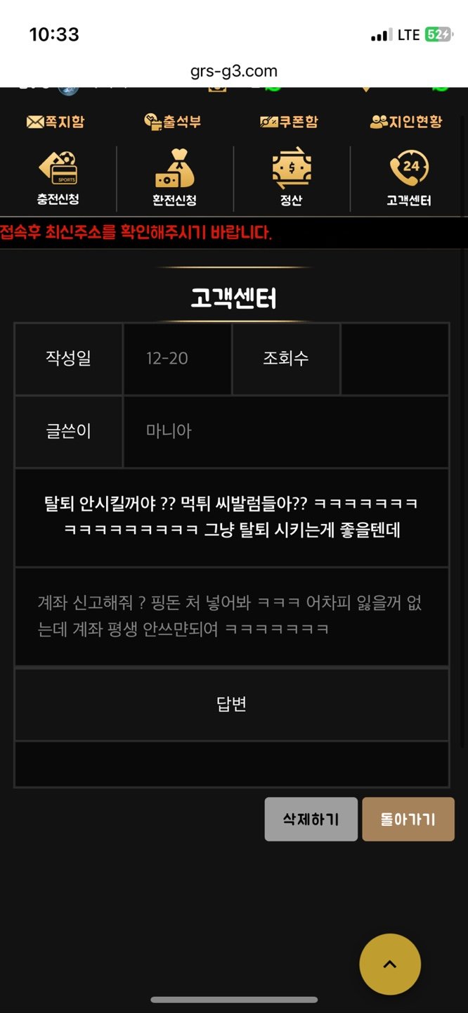 그리스먹튀 작성자 정보 도라지차쪽지보내기 메일보내기 자기소개 아이디로 검색 전체게시물쪽지보내기 메일보내기 자기소개 아이디로 검색 전체게시물 작성 작성일 2024.12.20 23:38 컨텐츠 정보 83 조회 2 댓글 목록 본문 닉네임 중중중 80>500. 먹튀 핑돈쏜다고협박 관련자료 이전 예상대로 땅마 현마 였네요 작성일 2024.12.20 23:40 다음 건승 작성일 2024.12.20 23:25 댓글 2 도라지차님의 댓글 도라지차쪽지보내기 메일보내기 자기소개 아이디로 검색 전체게시물쪽지보내기 메일보내기 자기소개 아이디로 검색 전체게시물 작성일 2024.12.20 23:38 답글 [https://mtbangkok.com/data/editor/2412/cmt_2049673361_tdVmqKh6_f135e2ccade38e5788946190aa09be18c88b70cd.jpg] 도라지차님의 댓글 도라지차쪽지보내기 메일보내기 자기소개 아이디로 검색 전체게시물쪽지보내기 메일보내기 자기소개 아이디로 검색 전체게시물 작성일 2024.12.20 23:39 지인이연락하니 핑돈쏜다고함. 답글 지인이연락하니 핑돈쏜다고함. Select File Upload File 목록